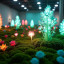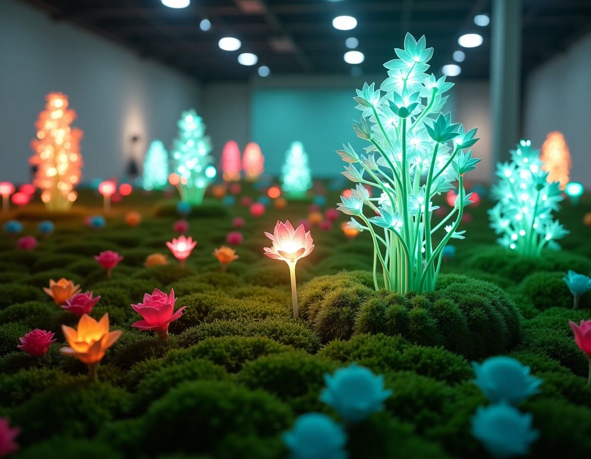 Eine futuristische Pflanzenwelt aus Robotik, in der die künstlichen Pflanzen auf Berührung, Licht und Geräusche reagieren, um die Verbindung von Natur und Technologie zu erforschen.