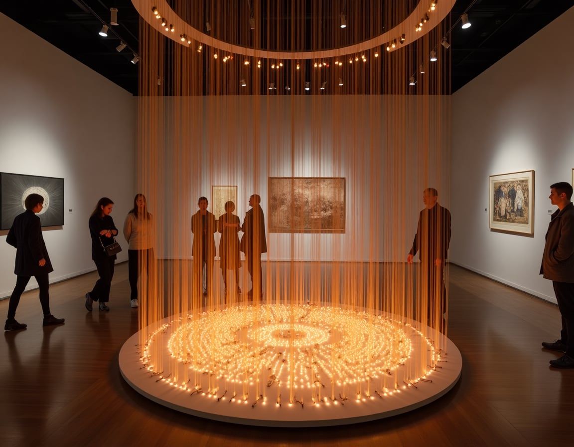 Besucher können an gespannten Textilsträngen ziehen, die je nach Bewegung verschiedene Klänge erzeugen. Eine Verbindung von Materialität und Klang.